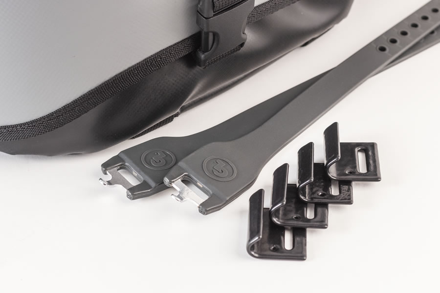 KlamathはGiant Loopのテールラック、ほぼすべてのオートバイのテールラック、多くのダートバイクのリアフェンダー、Giant Loopのシスキューパニアやモハビサドルバッグにしっかりと取り付けることができます。25インチのプロングホーンストラップが2本付属しているので、素早く簡単に取り付け、取り外しができます。