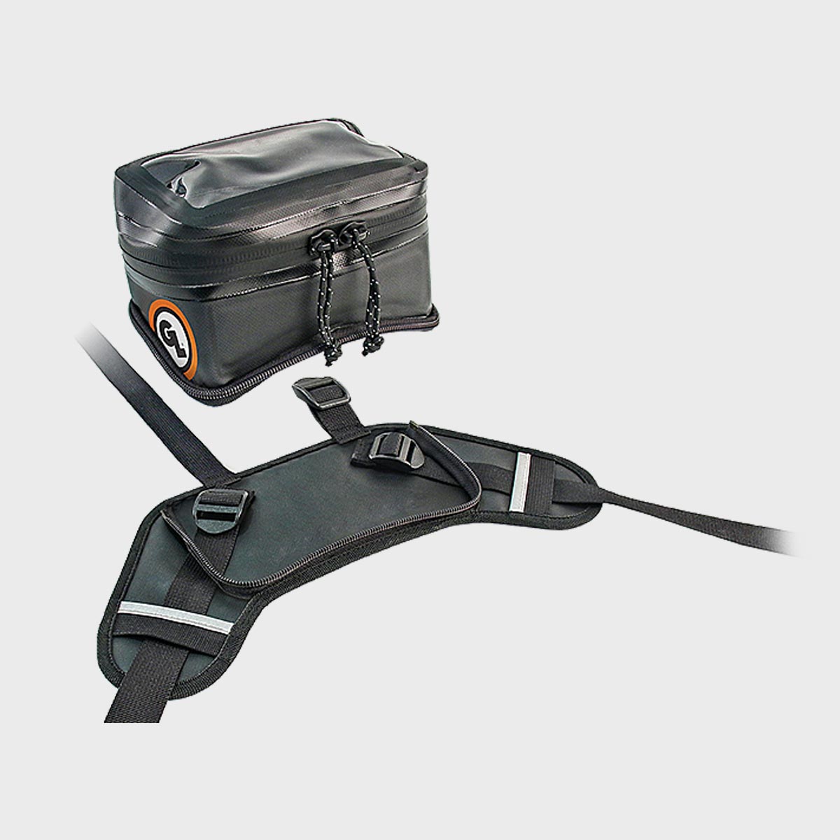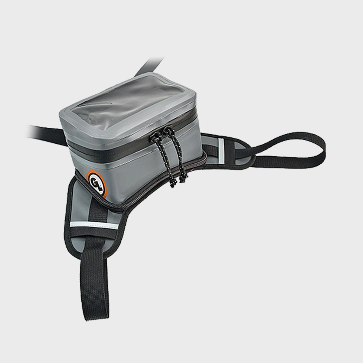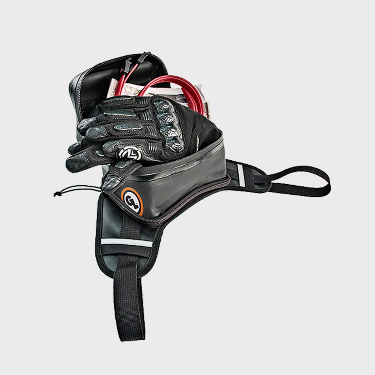 取り付けが簡単なこのタンクバッグは、防水コーティングされた素材を使用した完全溶接構造で、スマートフォン、財布、スナック、小型ツール、予備のグローブなどを入れられる1.5リットルの容量を備えています。